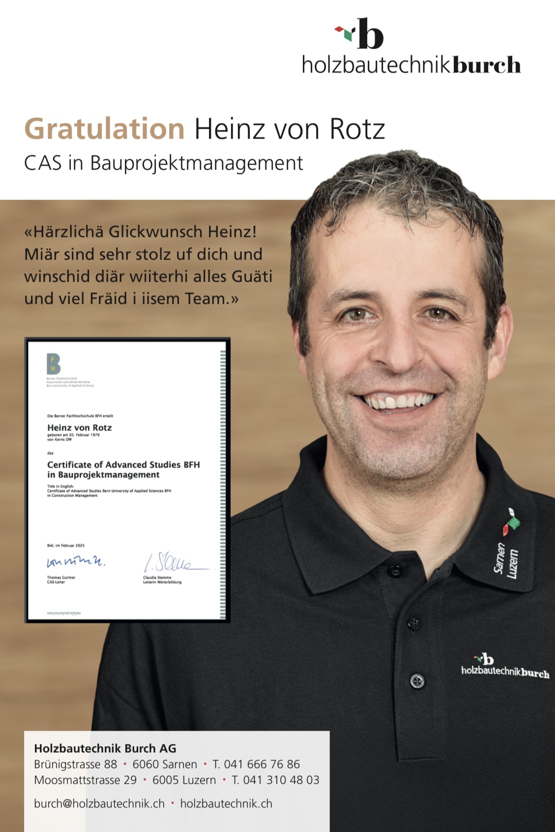 Ronny Barmettler hat berufsbegleitend die Ausbildung zum Dipl. Holzbau-Bauführer HF an der Bauschule (Schweizerische Bauschule Aarau AG) absolviert und mit Erfolg abgeschlossen.