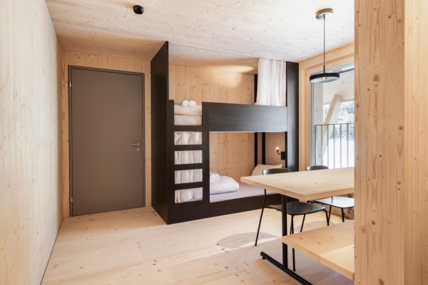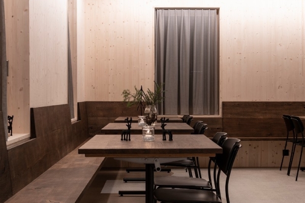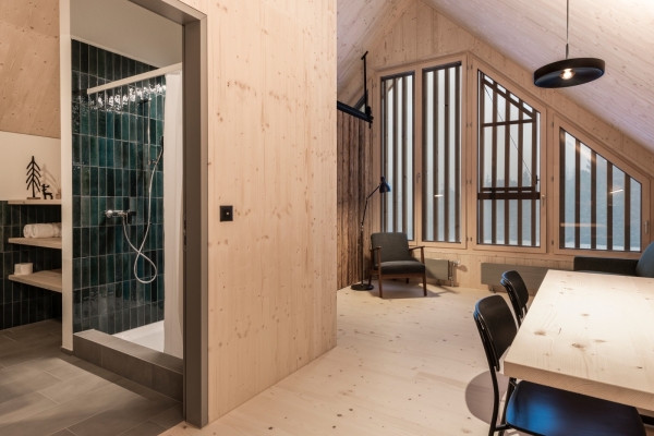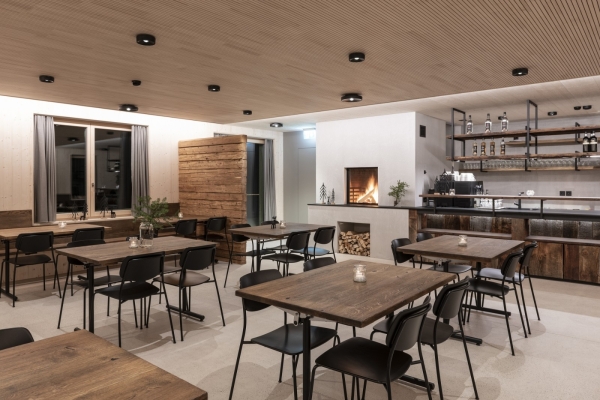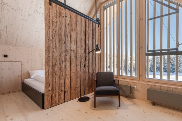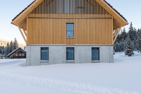 Das Gästehaus mit Eventraum ersetzt das ehemalige Stallgebäude. Die Elemente der traditionellen Scheune werden in der Materialisierung aufgenommen. Über dem muralen Sockelgeschoss in Sichtbeton ist das Relief der Holzfassade durch Lamellen gestaltet. Diese kleiden die Giebelfassade und daraus entwickeln sich die Streben des Vordaches. Innere Oberflächen sind mit Fichte bekleidet, Zimmer mit schwarzen Einbauten gestaltet. Durch verschiedenste Altholz-Elemente sind Teile der alten Scheune erhalten
