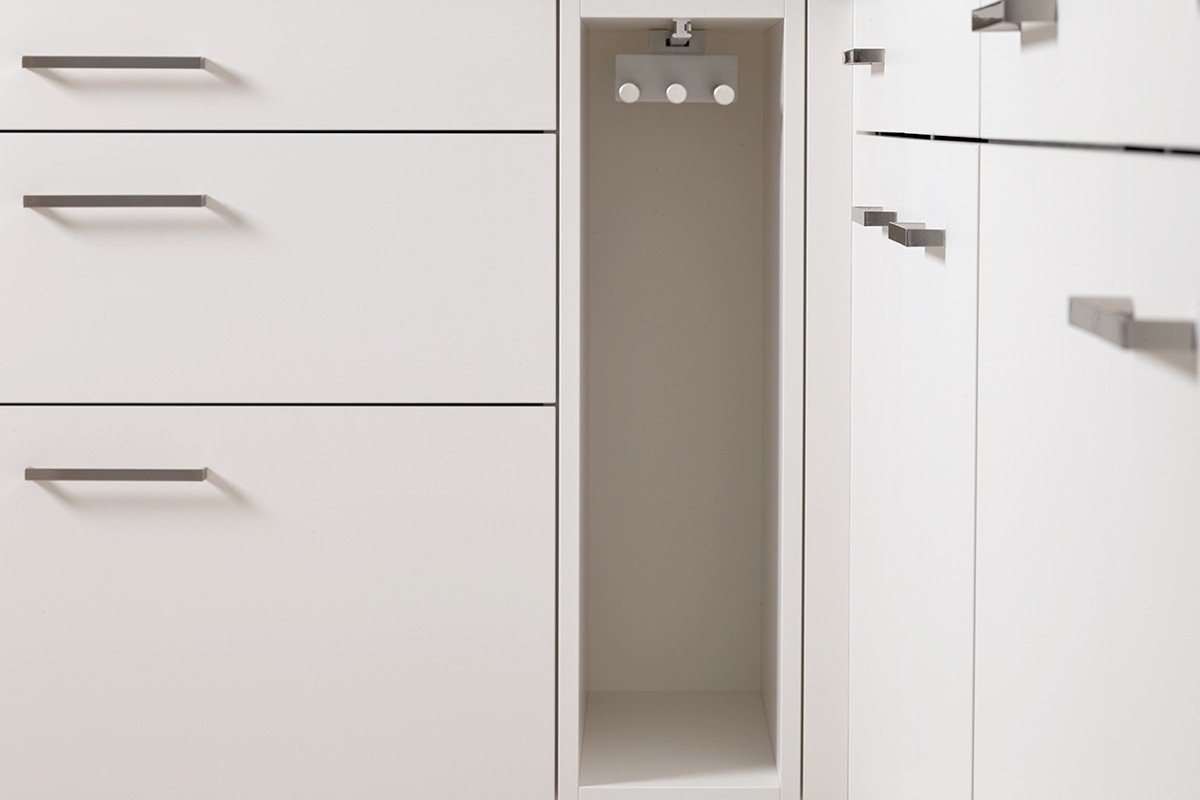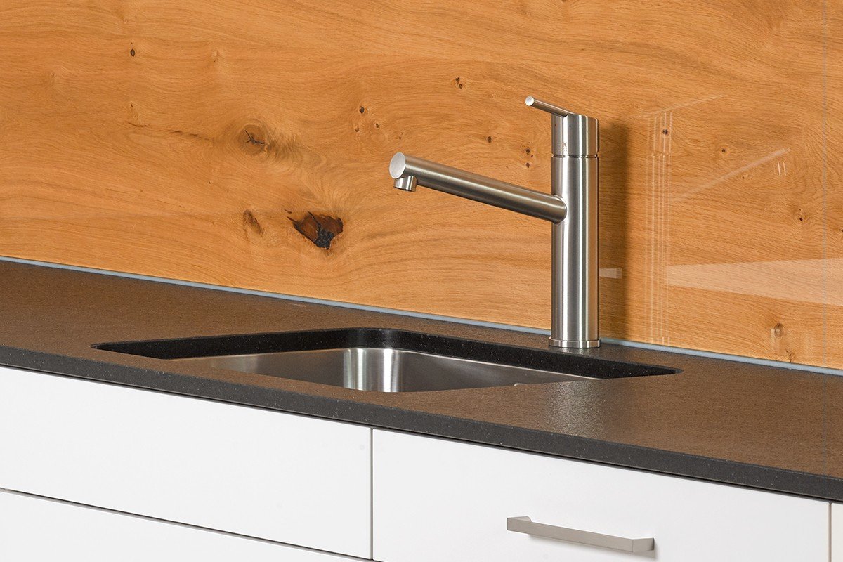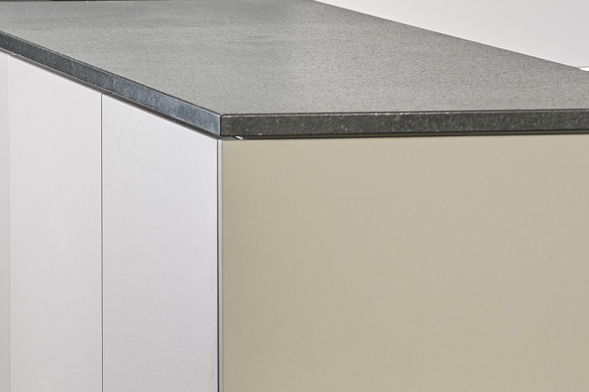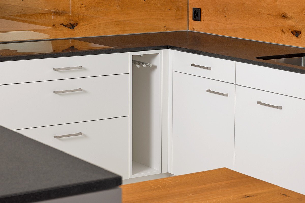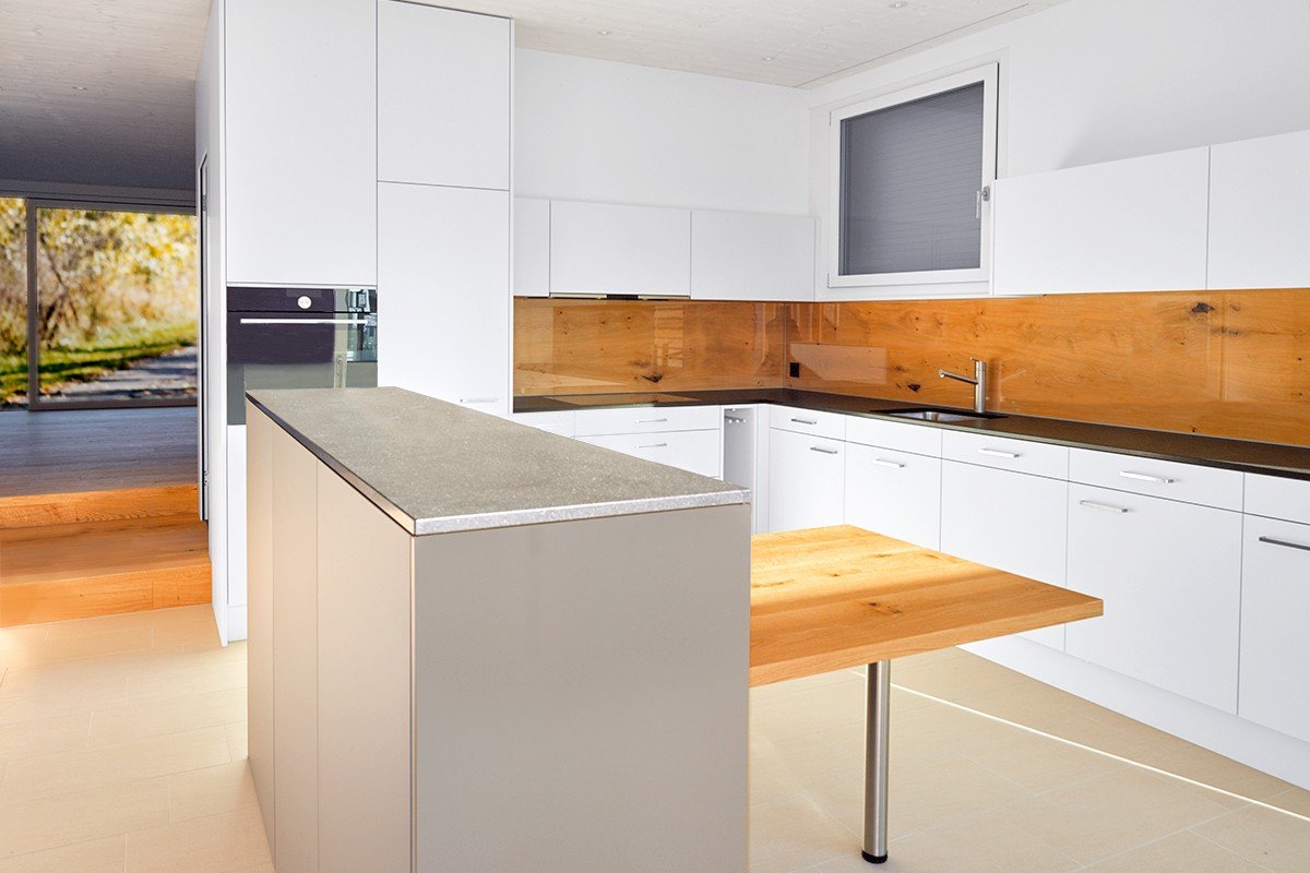 Details/Beschrieb | Die weissen ultramatten Küchenfronten wirken im Zusammenspiel mit der Natursteinabdeckung und dem Holzkontrast modern. |